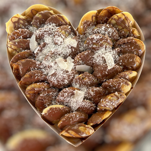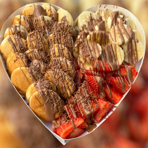 Palačinkové srdce s mléčnou čokoládou, jahodami, banány a ko...