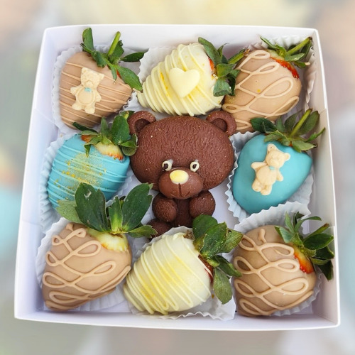 V bonboniéře je 8-10 ks jahod a čokoládový medvídek.