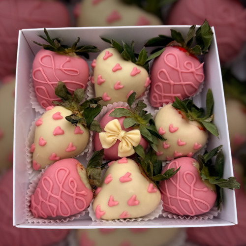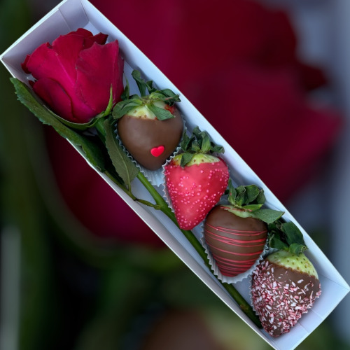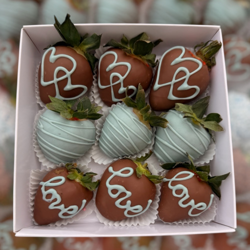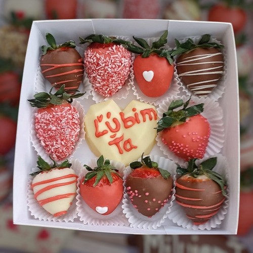 V bonboniéře je 8-10 ks jahod a srdíčko s nápisem Miluji Tě.